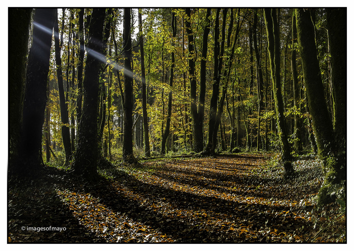 Finally I got out to take a new photograph! Its raining again, but the forecasters said we "might have showers , some of them heavy, in the morning, with rain spreading from the West in the afternoon" Now if you live in Ireland you would know that at least with showers the rain might stop occasionally. So I decided to go to Moore Hall and try and get the last of the Autumn colours. It was indeed a lovely morning and with dark skies and occasion spots of rain, but when the sun did break through it was really lovely. There were not a lot leaves left on the trees, but there were the occasional splashes of colour, and shooting into the sun this was the best spot. I shot this angle several times, because it took a few attempts to get the exposure right and I had to get the sun just behind a tree so as not to have it overwhelm the photo.