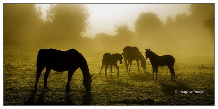 We had a lovely foggy morning this morning and I went out shortly after sunrise hoping to get some fog pictures. Fog changes everything because shapes become much more important. I was distracted by this group of horses and so stopped for a couple of minutes. The couple of minutes became several however as it took quite a while to get a moment when there was separation between the four of them, but it happened for just a couple of seconds.