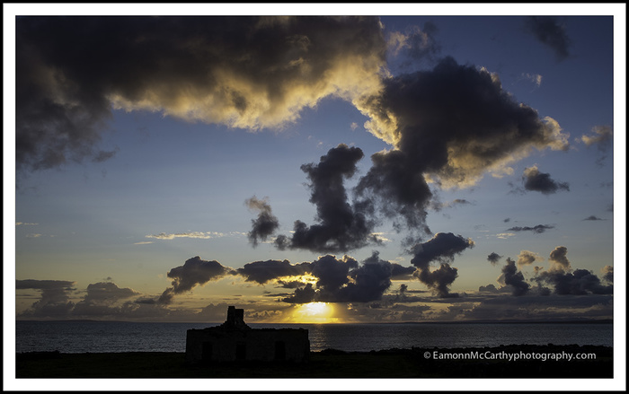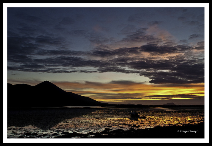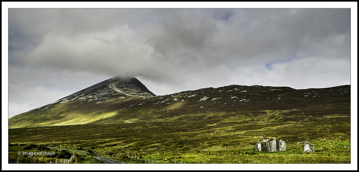 I made this image of Croagh Patrick on Wednesday morning, as you can see it was a cloudy morning but enough sunlight broke through to just make the scene a little more interesting. The building you see bottom right was once the local school! It is about ten years now since I first photographed it and it is deteriorating fast.