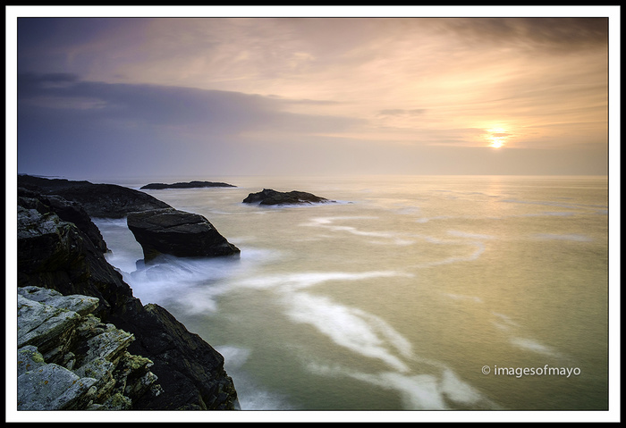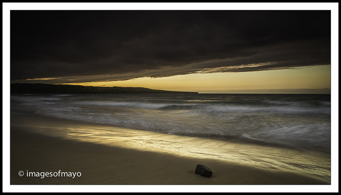 I am just back from a wonderful evening of photography. I had planned to go out this evening , but the weather was not great and I nearly decided not to go. as I drove north towards Ballina and then Killala, it was very cloudy with misty rain. The weather forecaster on the radio confirmed what I was looking at through the car window and the urge to go home was very strong. but I decided to stick with the plan "you need to be disciplined about this " I told myself, "who won't get any pictures back at the house". So I continued as far as Kilcummin and went to Lacken Back Strand. As you can see there was a clearing in the sky, although there was misty rain as I walked onto the strand. I did not actually see the sun at anytime , but the light on the beach was magical!