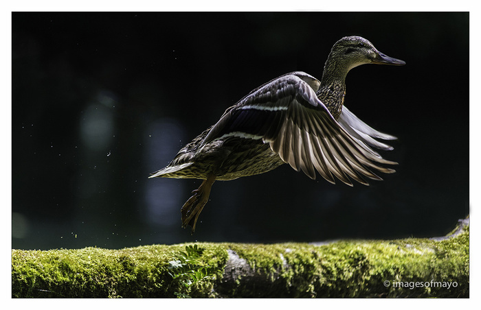 I was at the duck pond in Beleek Woods Balina at lunch time yesterday . This particular duck was sitting on a log and I could see that if I could get to the other side of her, the light would be right for her portrait! So I walked around the pond and got a couple of pictures, which I needed, to get the exposure right in the tricky lighting conditions, but she lost patience with me and decided to take off, and I only had time for the one shot!!