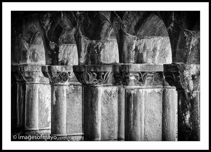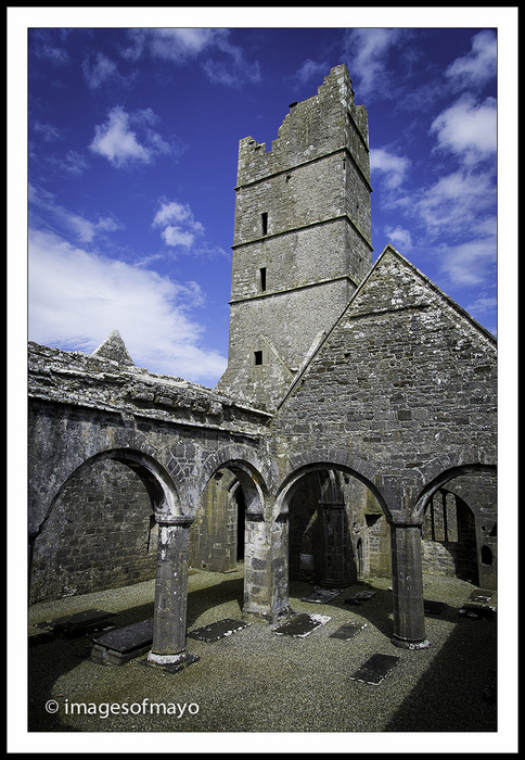 This picture was taken last week in Moyne Abbey. The widest lens in my camera bag is a 24mm. I am sure you will be aware that a wide angle lens distorts building terrible. To get this picture I am standing in a corner of the abbey unable to go back any further, in order to get the tower into the picture I had no option but to tilt the camera up, that just makes the distortion worse. So I decided to try raising the camera as high as I could. So I put it on a tripod extend to 6feet and then using the self timer to fire the camera I raised the camera over my head, so the camera is now about 12 feet off the floor. Of course this took several attempts some pictures included the tower and some did not! But after about half a dozen attempts I landed one! The distortion is still present but is not so pronounced, and I think the image does have an interesting perspective.