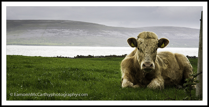 Spent a lovely day out with Tricia today, we visited Kinvara in Co Galway, spending some time and a little cash at the farmers market, then we drove into Co Clare and spent some time exploring the coast. The weather was not great for pictures as the light was by and large flat, but it was still a lovely day. Here is a picture taken today, I spotted this cow lying in a field which was higher then the road, the poor cow got a bit of a surprise when my head and camera appeared under the fence!