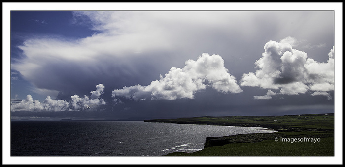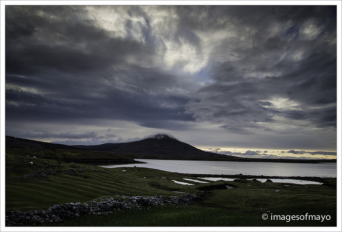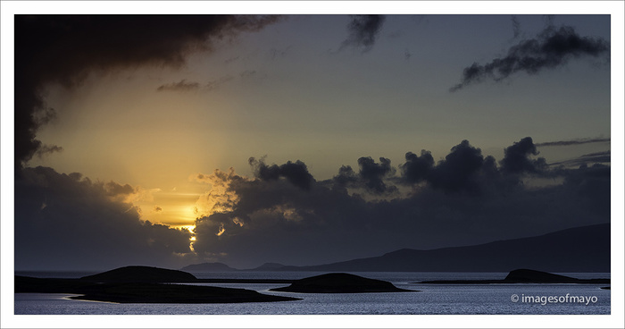 Whenever i go out to take photographs, especially in mayo, where the weather changes so much, it can be very hard to predict the results, and in truth if I waited for the weather to be "right" I would spend a lot of time indoors!. This picture was made on a trip to Bellacragher Bay to photograph the sunset, in my mind I was hoping for the lovely golden colours of sunset. As you can see however the low clouds rolled in and I did not see the sun set, but just look at that sky!!! It was worth the trip out and once again I was glad I had not stayed home cursing the weather!