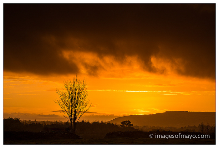 I described how in yesterdays picture we did not find the crock of gold, but there was plenty of gold about. When you see a picture of a rainbow with dark black skies you know that the sun is behind the photographer. The light was so exciting for those few moments yesterday I almost did not know where to look, the light on the hawthorn with the rainbow behind it was magical, but equally magical was the setting sun that was behind me , lighting the hawthorn and creating the rainbow., and also creating a golden sky over Sleive Cairn. By going up the Bog Road in Cultrasna, I was able to photograph the same hawthorn tree from the other side, beauty all around!