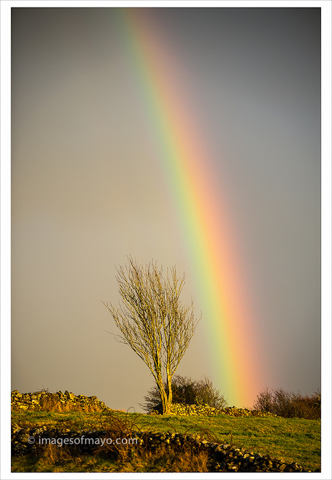 Took this about half an hour ago, driving into Kiltimagh from Knock I saw this rainbow beginning to develop just as we arrived into Kiltimagh, so there was nothing for it but to turn the car around and head back out the road again. Trying to find a base for the rainbow I turned into Cultrasna and spotted this hawthorn bush. The rainbow lasted long enough for the picture, we did not find any Gold, but behind us the sun started to set and the sky turned gold for a few minutes, so once again it was back into the car and up the bog road to capture the golden light, I might show you that picture tomorrow evening!