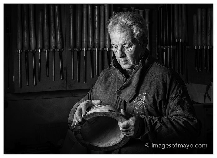 Very late posting this evening, but I am not long home from a lovely evening in the presence of woodturner Paul Tante. Paul asked me to help him with some images of his amazing work for a new website he is constructing. So we spent the evening photographing lots of pieces everything from large bowls to the tiniest of little ornaments, he is a very talented man, and as soon as his website is ready I will share it with you. After we had finished photographing all the pieces I asked Paul if I could get a picture for myself, this is it, a simple shot using a single flashgun in a small soft box held by Paul's wife Maria. I know its not the usual kind of posting for "images of Mayo" but I was delighted with how it turned and I am teaching members of the Mayo Camera Club how to operate off camera flash so it was good for me to get a little practice!!