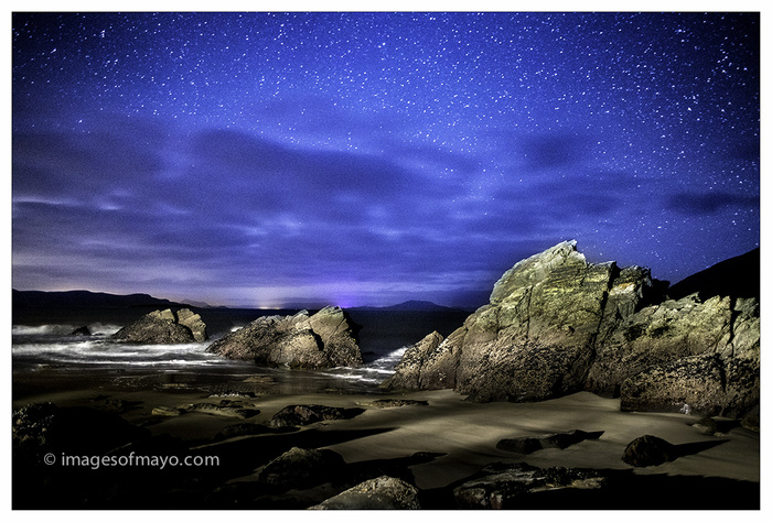 Everything looked like it would be in place, the moon was up during the day, the low tide was exceptionally low at .4 of a meter and it looked like the weather would be clear. Low tide was due at 11.48pm so we decided to go to the cinema in Castlebar on the way there!! Of course the movie finished later then I expected and the journey took longer then it should so we arrived 40 minutes after low tide so the tide was already on the way in, however I got to the spot and set up the camera as quickly as I could, I spent a total of twenty minutes between pressing the shutter for the first test and leaving the scene, and the tide had risen considerably in that time but not enough to cause any concern, but even so I knew I could not afford to hang around. as you can see we got the low tide, the moonless sky, but not quite the clear night I had hoped for , still it was worth the attempt and I may try again sometime !