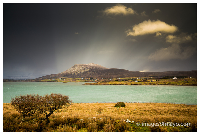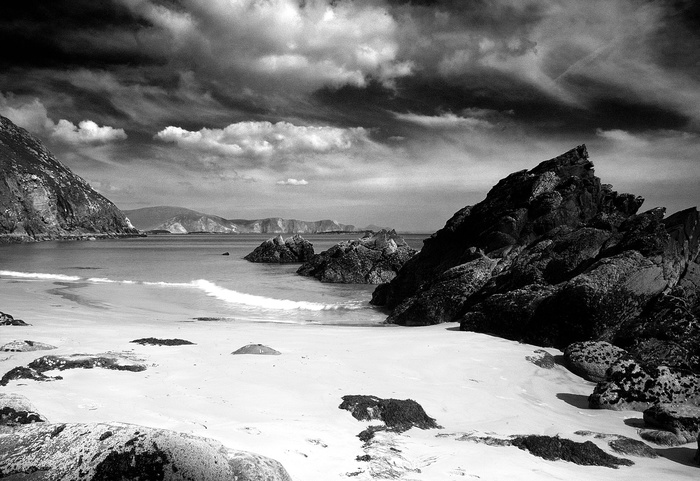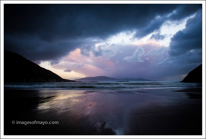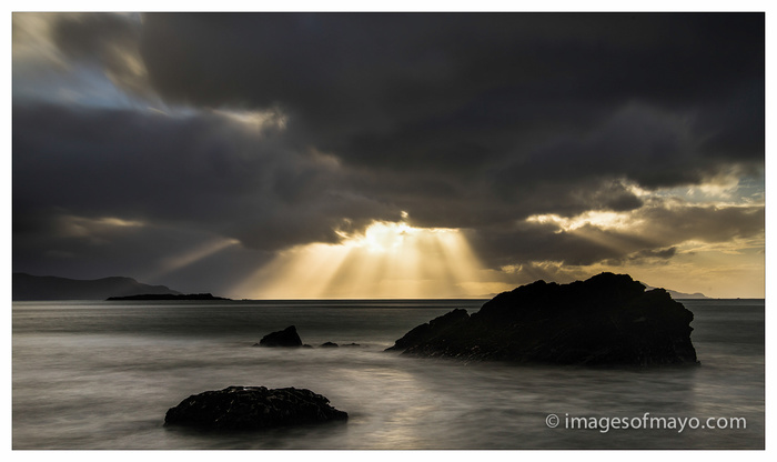 I made this image last week on Achill, taken between showers ,I used a ND filter to give a slow shutter speed which smooths the water and gives movement to the clouds.