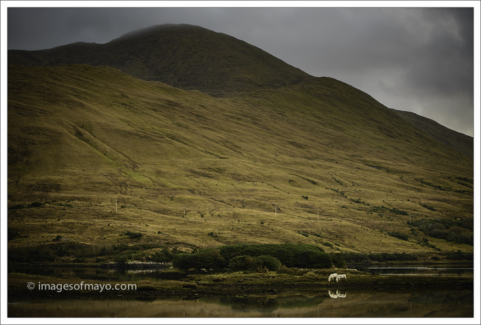 Connemara is as you know famous for both its scenery and of course the Connemara pony. I was recently returning from photography trip to Connemara with a fellow photographer who had booked me for a day's photographic tuition . We had had a very succesfull trip and were returning home having just photographed a lovely sunset over Killary Harbour. Even though the sun had left the sky and it was getting dark, the sight of these two ponies across the harbour stopped us in our tracks, I did a Uturn in the car back to a gate into a field so that I could pull the car off the road. We then spent what seemed like an age waiting for the pony at the back to just take a step or two forward so as not to be hidden by the one at the front ! Eventually it obliged!
