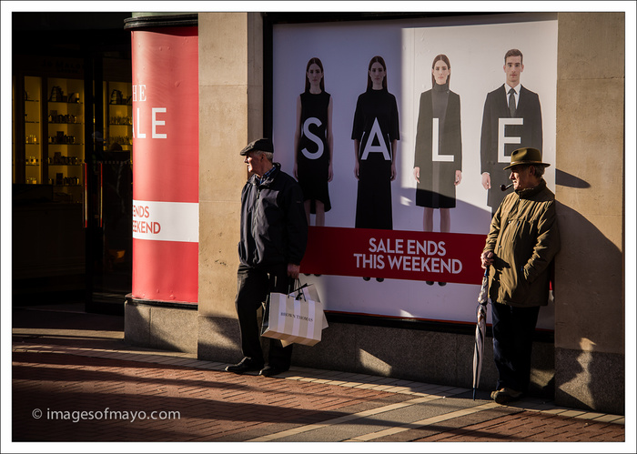 Here is something a little different from me today, and its not even in Mayo. I was in Dublin a week ago today on Grafton Street, the city's busiest pedestrian street. I was on my way to a camera shop when I spotted these two men, I assume waiting. I don't normally do "street photography" but there just seemed to be a picture right in front of me that I could not resist. I am not sure was it the light on their faces or the four figures behind them, or just that they were stopped on the busy street that prompted me to take the picture. It was maybe a combination of all those things .