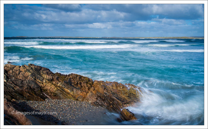 I was on Belderra beach in North Mayo, and it was lovely. I was there to photograph the rocks rather then the water but the sea was amazing with the waves rolling in. I thought I might take a trip to Downpatrick head for the BIG waves on my way home. But before that I had to photograph the rocks. But I photographed this little spit for myself, before climbing onto the same spit of rock to photograph from it. Now I had watched it for several minutes and the swirl of water you can see at the end of the rock was as "dangerous" as it got. There is an interesting rock formation just off camera to the left, on top of the rock you are looking at. I went over to it and photographed it, I was there five or ten minutes and the sea remained the same. Then as I stood 6ft4 high with my camera to my eye a wave just leapt up and completely engulfed me, right over my head! Camera and all!!!! Wow I got such a shock and despite wearing a coat I was soaked through to the skin. The camera is currently drying in the hot press.