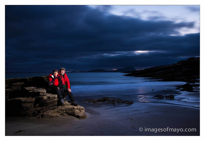 Busy day today, I am in Mulranny leading a landscape photography course. The weather was pretty bad when we started our evening session and we debated wether it was worth going out or not! We did not see the sun and the cloud cover was very low making it very dark. We still made pictures however and everybody was happy to have made the effort, and surprised that good pictures could be made in such conditions. We were leaving the beach about an hour after sunset time when I asked Sue and Pete from Alaska to sit for a quick portrait using off camera flash . This is a 5 second exposure @ f8 and iso100. The flash, a Nikon is at full power.