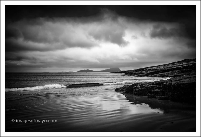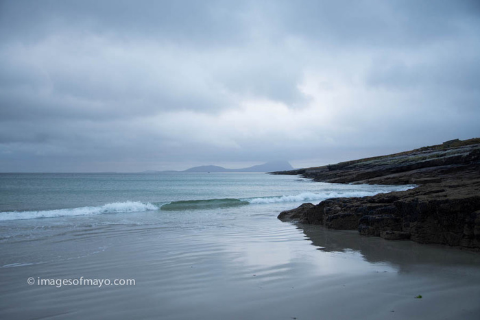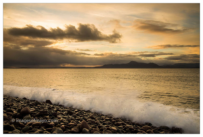 Yesterday I went to Achill, to photograph rocks at Accorrymore. But I leftthe house early in the hopes of getting a sunrise at Mulranny. I arrived in Mulranny twenty minutes before sunrise, then I just sat in the car and watched the rain ! Sunrise time came and went but I did not see the sun, I could see the clouds begin to clear over Croagh Patrick and so I waited and waited, eventually they cleared enough for me to get a picture. We Landscape photographers spent lots of time, planning, driving, walking, and waiting!!