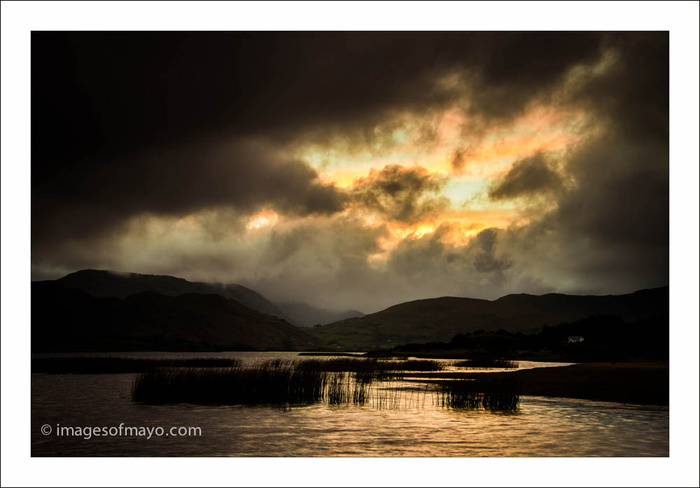 Plenty of rain today, with heavy clouds in the sky. It cleared a little in the afternoon so I took a trip to Lough Mask, there seemed to be more cloud there then when I left Kiltimagh. The sun did its very best to break through but it just failed! However the little light there was along with the dark clouds made for a very dramatic scene.