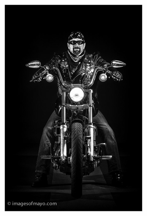 Here is something just a little different!! I am a member of the Mayo Photographic Club and we have resumed meeting on Monday evenings. This evening one of the members had arranged for his pal, Sean to bring in his Harley Davidson Motorcycle, for some photographs. We met in a multistory car park. So this was a real exercise in lighting, using flash the challenge was to light Sean but exclude all the light in the car park and of course the other 20 photographers who were also working. It took me a little while to set up the flashes before Sean got on the bike, I did not get any great pictures of the bike itself, but I was delighted with the result of this portrait.