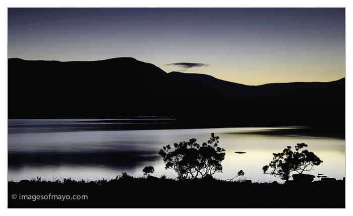The best time for landscape pictures is usually about an hour before and and an hour after sunrise and sunset, but sometimes its hard to know when to stop! last evening I went to Lough Feeach near Newport to photograph the sunset. The sunset itself was very disappointing due to the absence of clouds in the sky but I worked the area anyway. I was doing some long exposures on the shore of the lough with limited success long after the sun had dropped. I was still there when the bats came out and buzzed around me, I wished them well, assuming that every time they passed me they were removing another few midges who would otherwise be eating me. Anyway an hour and fifteen minutes after the sun had disappeared I decided I needed to go home, packed up the gear and went back to the car. Threw the gear in the car had one look back at the lough and saw this!!! So all the gear came out again and I looked for a pleasing composition ! iso200 f8 10seconds.