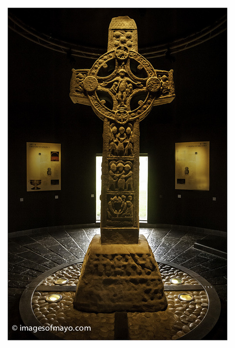 On our recent visit to Athlone we called into the Abbey at Clonmacnoise in Co Offaly. Clonmacnoise is one of the most important of the ecclesiastical sites in Ireland, there are several Celtic High Crosses and two round towers, though only one is complete. There is also a visitor centre with information about the site. This High Cross replica is in the centre. It is located in a darkened room but the cross itself is well lit to show the carvings on the cross. If I had photographed it using flash the flash on the camera would have ruined the effect of the lights, and I assumed I could not use a tripod so I set the iso at 5000! and an aperture of 3.5 ( as wide as the lens would go) I was using aperture priority with exposure composition set to -1. This is because the camera would have reacted to all the dark areas and tried to brighten the picture . Anyway this resulted in a shutter speed of 1/400sec plenty fast enough to handhold the camera.