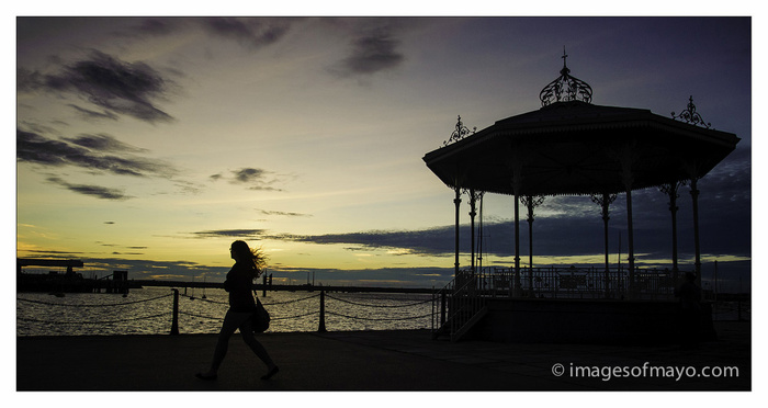 I am in Dublin this evening, and very nearly failed to get a picture. After a busy day we made a dash to Dun Laoghaire Pier hoping to get a sunset. I lived close by as a child for a number of years and walking the pier brings back many memories.We were just too late for the sunset and I had not brought a tripod, so decided to try a a simple silhouette . I tried one with just the bandstand but it was not very interesting, so I asked my daughter Grainne to walk into the frame to give a bit of balance!!