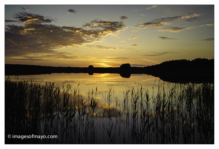I am one of those Landscape photographers who much prefer winter to summer. Now don't get me wrong, summer is great, but for landscape photographers the best time to get exciting pictures is just before and just after sunrise and sunset, and in the hight of the summer the sunrise is just too early and the sunset too late. And during the day the sun is very high in the sky (if we can see it at all!) and so does not make for interesting shadows etc. Anyway today I had a real urge to get some photographs, most of the day was grey and cloudy, and then there was the wimbledon final to watch, closely followed by the Grand Prix. Feeling guilty for sitting for so long in front of the tele I went for a cycle it was around this time that the sun finally started to break through and I thought "there might be a sunset. So I dashed out to Claremorris to Lough Na Annagh getting there just before sunset. This picture was made at two minutes past ten, about five minutes after the sun had set.