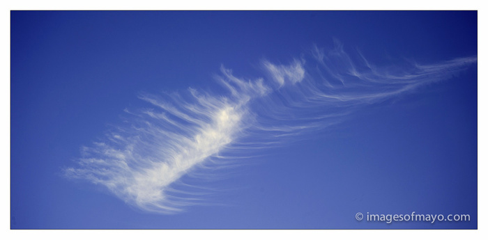 I am sure you have heard of a mackerel sky? Well today over mayo the sky was blue, and in the morning there were very few clouds at all. I dont know enough about the different types of clouds, given that I am a landscape photographer who is always watching the sky I should really. But I believe the cloud in this picture is a Cirrus Cloud. I am sure there are those of you who could tell us what kind of Cirrus cloud. But when i spotted it this morning I immediately thought of a title for a picture. " Mackerel Sky, after the cat got it"