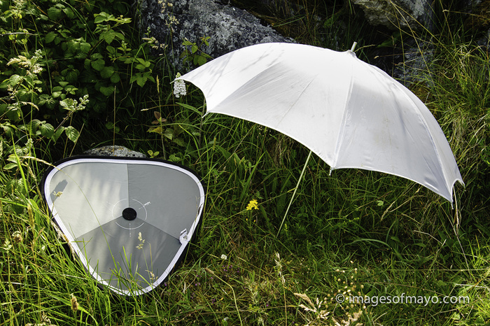 I thought this evening I would post a "behind the scenes" picture which might prove helpful to some of you. In the last couple of days I posted some flower pictures, they were both taken on sunny days which can create its own difficulties in holding detail in the flower, particularly the white orchid. The umbrella you can see is a shoot through umbrella normally used in the studio in front of a flash. But it does a great job of creating nice even light for the flower portrait also!! Cost about €20 and it folds up and is easy to carry. Although the umbrella is not actually set up for the picture you can see the white orchid I posted yesterday in the picture. The grey triangular shaped thingy is a grey card which is used to set white balance, that way you can get accurate colours of the flower,and can also be used to set the exposure. if you photograph the scene with the grey card in it , when you open the picture in photoshop or lightroom simply clicking on the grey with the eyedropper will set the correct white balance.