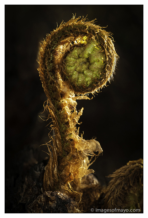 I was out for a run today, up a local hill called "spankers hill" locals will know how steep it is! Anyway I clearly was not running very fast as I observed how the ferns were coming back having been burnt in a bog fire earlier in the year. So I decided to go back up the hill in the evening when the sun would be low and would light the ferns dramatically. My little van failed to go up the hill so I had to abandon it half way up and walk !! But it was worth the effort as the sun was "just right" lighting the fern from behind . I used a flashgun set to TTL -1.7 to give just a little light to the front of the emerging fern frond.