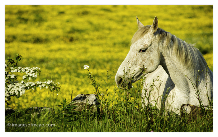 The warm weather of the last few days has brought a dramatic change in the landscape. The buttercups are in full bloom , in some places turning the previously green fields completely yellow. I was wondering how to photograph this in a way that would be interesting when this evening on the road between knock and Kiltimagh I spotted this pony. When I saw it , it was grazing in the field but as soon as it heard the diesel engine stopping and the car door closing it promptly made its way to the fence assuming this person was going to feed it . I waited for a good twenty minutes but it refused to return to the buttercups , not only that but it kept its head close to an electricity pole so I could not photograph it. I set up my composition so that the field of yellow was in the background, and waited and waited, I made all kinds of silly noises as I tried to get the pony to look to its right. But he stubbornly refused, I wondered was he a pony or a mule he was so stubborn and told him so!! Eventually however he did put his head in the right direction, I manages three photographs, and I kid you not, he had his eves closed in the other two!!!