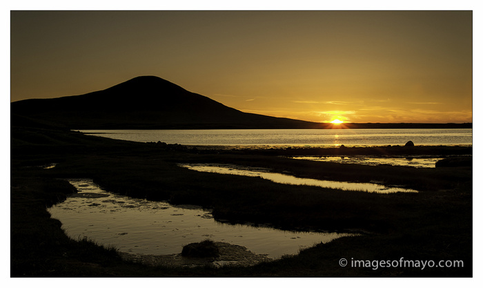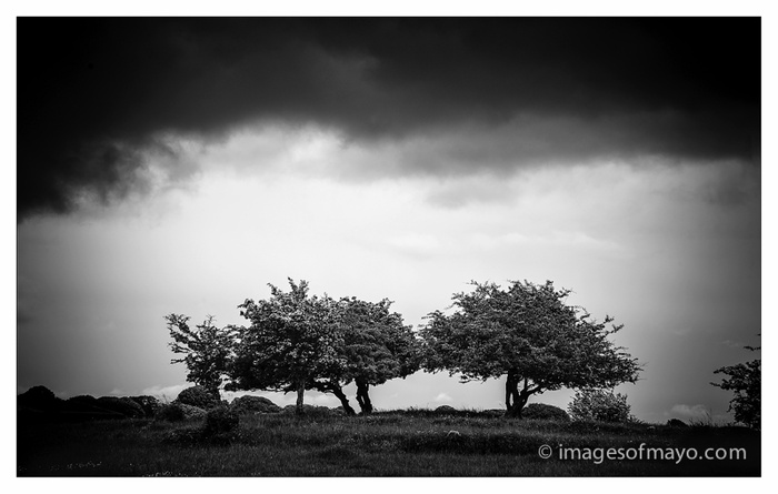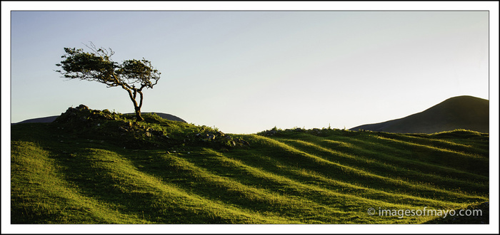 Yesterday evening I was in Mulranny to meet with a group of photographers visiting for the weekend. I showed them some images of the area and gave them some information on photographic locations and sunset and sunrise times. After I left them I took a drive out the Bangor road and stopped beside a cottage to photograph a hawthorn tree . I was approached by the women from the cottage and we chatted about the hawthorn. She invited my to Go onto her land to photograph some others. I was delighted because I always thought it a very pretty spot and had considered knocking on the door to seek permission. So delighted I untied the rope on the gate and ventured in. The land is made up off tiny hilly fields, covered in "lazy beds" divided by stone walls and scattered with Hawthorn or "fairy trees". I was there for an hour and half and became very frustrated because despite this being a photographers paradise I just could not make a picture! Every time I put the camera to my eye I could not get the composition right or the sun which was very bright, was I'm the wrong place. Eventually I found this composition however and made the picture. I am pleased but not delighted with the picture and will go back in a couple of weeks when the fun will have moved over to the right a little more and we might get a better sky !