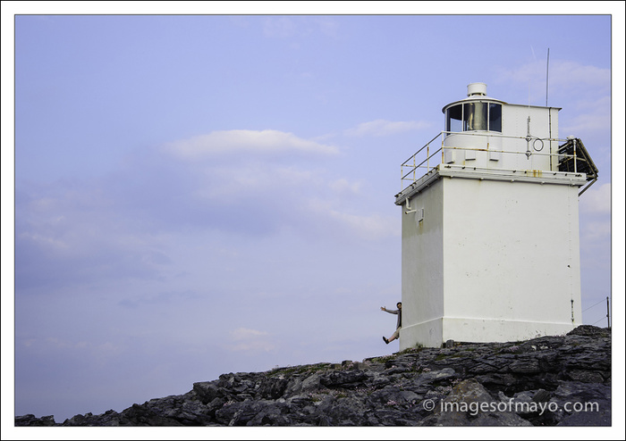 Patricia and myself were in Limerick overnight for a family celebration. We took the scenic route home this evening traveling through he Burrren. Passing Blackhead I said "I would nip out for a quick picture of the lighthouse" Quick usually means I am not taking the tripod and spending lots of time setting up , but it rarely means one picture. this was no exception, I took one quick picture then another and another, just changing my view slightly, all the time thinking "just one more, just in case". Of course Patricia knows I have photographed this lighthouse many times, and there was nothing special about the light this evening so these were just going to be more of the same pictures, so she snuck around the back, suddenly appearing to create a different picture!!! I had the camera to my eye when she suddenly appeared and disappeared as quickly, but she certainly added to the image!!!! We had a laugh and she apologized for ruining my picture ! I told her I had not taken her picture at all, and I have not told her I am posting it either, but you know what they say "he who laughs last laughs longest"!!!