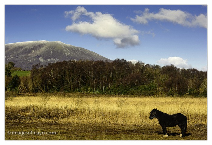 Its a dark and very grey morning here in Mayo this morning, lots of rain forecast. here is a picture I took last week on a brighter morning. I had gone to Lough Conn to get a photo of some boats with Nephin ( the mountain) in the background, this horse was an unexpected bonus!