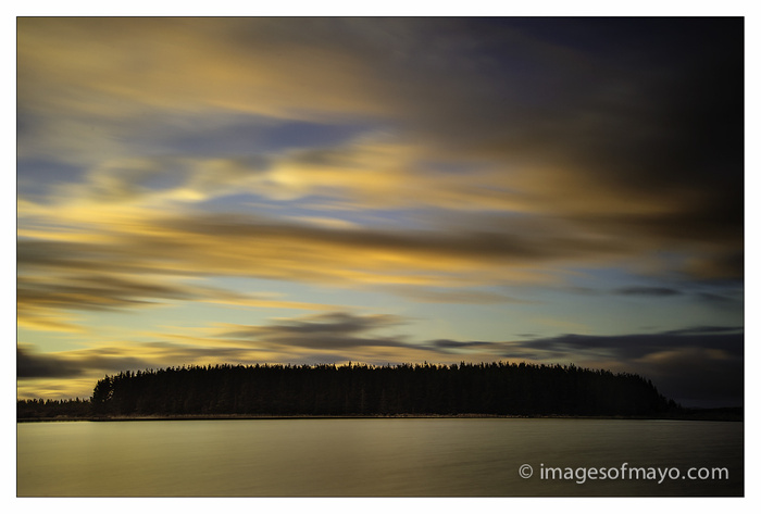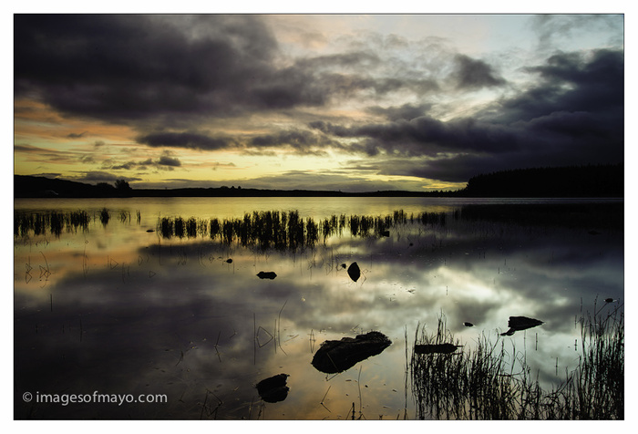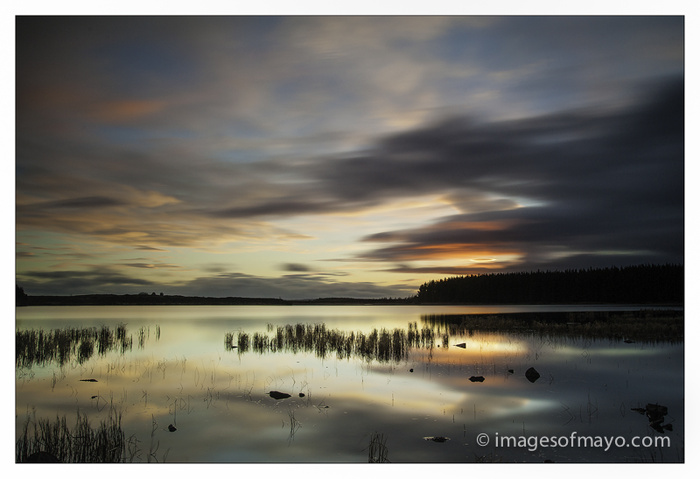 Yesterday evening I took a trip to Lough Nambrackagh , between Swinford and Kilkelly. This image is a thirty second exposure . I had the long exposure noise reduction switched on in the camera, this means that a thirty second exposure takes another thirty seconds to write the file , so each picture takes a minute to make. A minute does not sound a long time but when the sun is dropping out of the sky it seems to speed up! And the thirty second wait between shots is very frustrating! I only got about five shots taken before the whole show was over!
