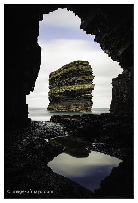 I had a lovely morning this morning. After all the grey cold days we have had , I looked out this morning to see that at last the sun was trying to break through and there were some breaks in the cloud cover. There was still a cold wind and I thought that Downpatrick head might be worth a visit. I was hoping for some big waves. When I got there the sea was flat!! Still, I thought, I'm here now lets go and have a look. It was at that point that I noticed the sea was not only flat but also that the tide was out and infact was lower then I had ever seen it . So I checked the tide times and discovered that it was still an hour before low tide, this meant the tide would go even lower. So I decided I might try and go around the headland , under the cliffs to the cave looking towards the sea stack (Dunbriste). Now I would not usually ever even think of doing this without somebody with me, and with a lot of planning, because it can be a very dangerous place . And it certainly was not part of my plan for today. But everything just seemed to be perfect. The tide was low and getting lower and the sea was unusually calm and the light was coming from the right direction. Saying a little prayer , I headed off. I got to the cave and took a number of pictures , all the time rushing, aware that I needed to get back before the tide turned, but I actually started the walk back at exactly low tide. reaching the car delighted that I had got to the cave and back safely, had got a couple of pictures, had experienced the magic of the place, and that Patricia did not even know I had been ( She worries).