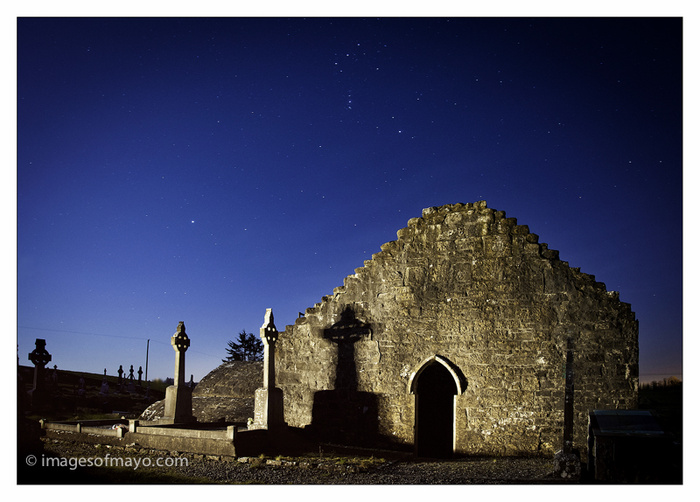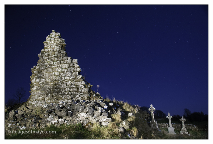 I did not get out with the camera during the day, but I had to be in Claremorris by 9pm this evening and it was such a lovely clear night that I thought to go early and visit the old ruin of St Colman's church on the road between Kitlimagh and Claremorris. There was a nice bright moon , which certainly helped me pick my way through the heavy undergrowth of the old graveyard to get to a spot where I could get a view of the ruin without any "Modern" lights from houses etc interfering with the composition.