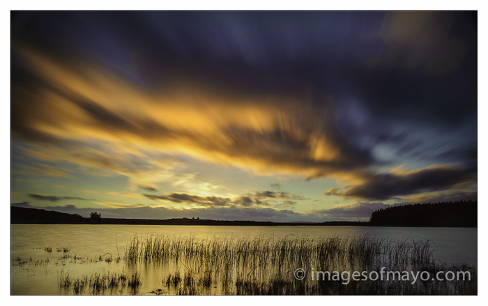 Yesterday I went to Lough Nanbrachna to photograph the sunset. I left the house giving myself plenty of time, and I was nearly distracted along the way by other potential photographs in the lovely evening light. I decided however to get to the lough early as the last time I visited I was rushing through mud and wet to get to the right position as the sun set. It was just as well I was early as this picture was taken twenty minutes before the sunset . As you can see in the picture there is some low cloud on the horizon which meant the sunset itself was disapointing but the magic had already happened. I have used a 10 stop ND filter to give a long exposure so as to get the movement in the clouds.