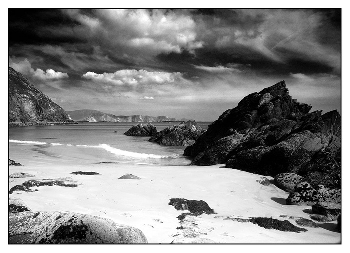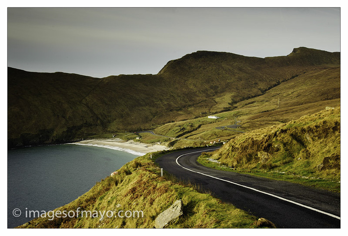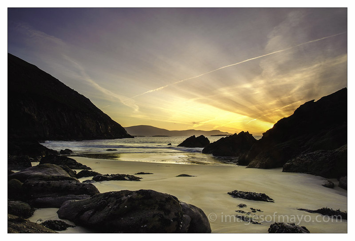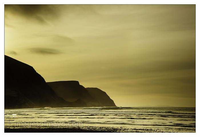 On my way to Keem Strand on Achill last Monday, you may remember I had to stop at Keel Strand because of the wonderful colour in the sky. As I travelled back from Keem a few hours later I just had to stop at Keel again! By this time the sun had come over the cliffs and so I had to walk the length of the beach to reach a point where I could photograph the cliffs without including the sun directly in the picture.