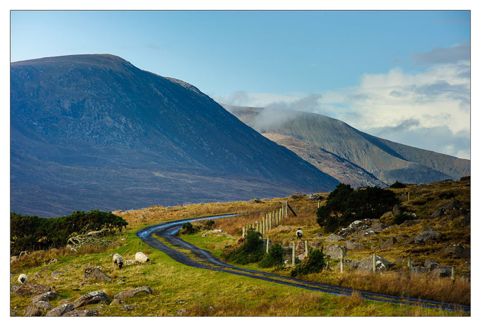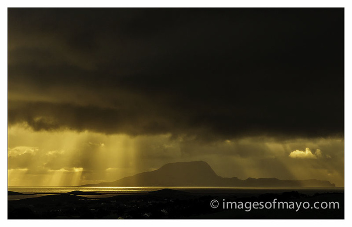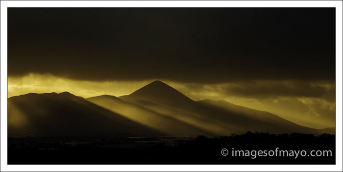 Yesterday I commented that the single biggest secret of success to capturing good landscape pictures is just "being there" I should have added "and have your camera with you"! Todays picture is a case in point. Yesterday after I had left John, I called to visit my friend Michael, also a photographer who lives in westport. As I left his house I could see lovely light on Croagh Patrick, knowing exactly where to go i sped up the road to a viewing spot and watched in awe as this beautiful scene played out in front of me. It lasted about five minutes before the sun was completely hidden by the clouds and everything became dull.