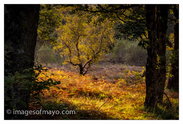 I took this picture a couple of weeks ago in Errif woods on the Leenane road. As you can see, I arrived just on time for some very exciting light, and I immediately thought of "the burning bush" because of the way the small tree or bush was lit.The angles that i could take the image from were very limited however , for example I tried to frame the picture so as to see the top of the bush but if I did sky appeared at the top of the frame which ruined the whole effect of the backlighting .and of course there was a race against time as the sun was sinking rapidly, infact if you look at the picture you can see that the sun is not hitting the ground just behind the bush and a few minutes later it was also gone from the bush. So I had to settle for this view of it, but I was still pleased with it.