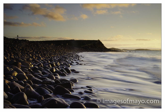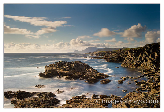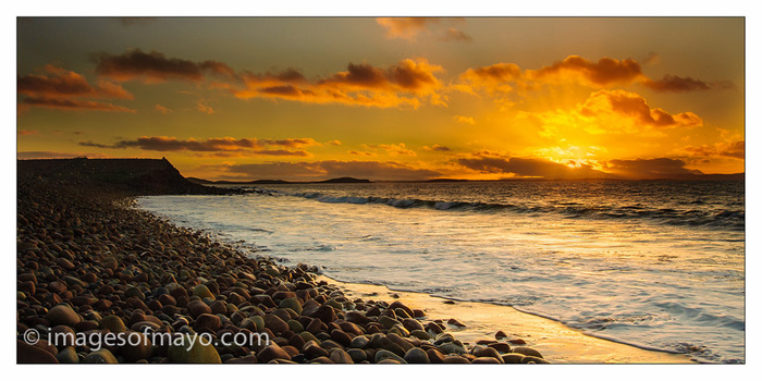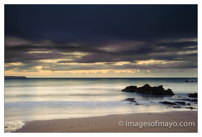 Today I was booked for a one to one photo class with John. John last came to me for lessons two years ago, but recently bought a new camera and needed a little help to familiarize himself with all the controls. John was staying in Westport for a few days and he suggested we meet at his hotel for breakfast at 9.45! Now for a Landscape photographer 9.45 is lunchtime ! So as I was going that direction anyway I said I would go early, get a sunrise and maybe some other pictures before meeting John for breakfast. I had decided to go to Achill for the sunrise, but I was a little late leaving and so went back to Mulranny instead. it was raining as I left and it rained for the whole journey which is about an hour. In the car I was listening to the radio and the forecasters were describing how "the last of the rain is just leaving the South East Coast, and its going to be a lovely sunny day though a little cold, there may be the occasional scattered shower on the West Coast." It seemed to me that this was a very long shower!! I arrived in Mulranny twenty minutes before sunrise and sat in the car and waited, it continued to rain, I did not see a sunrise, it continued to rain, but I waited. Then at 8.55am half an hour after sunrise the rain stopped, I still could not see the sun and the clouds were very grey, at 9.00 the clouds began to clear and the sun began the break through, at 9.05 I took this picture, at 9.15, I was back in the car on my way to Westport, arriving on time for breakfast!