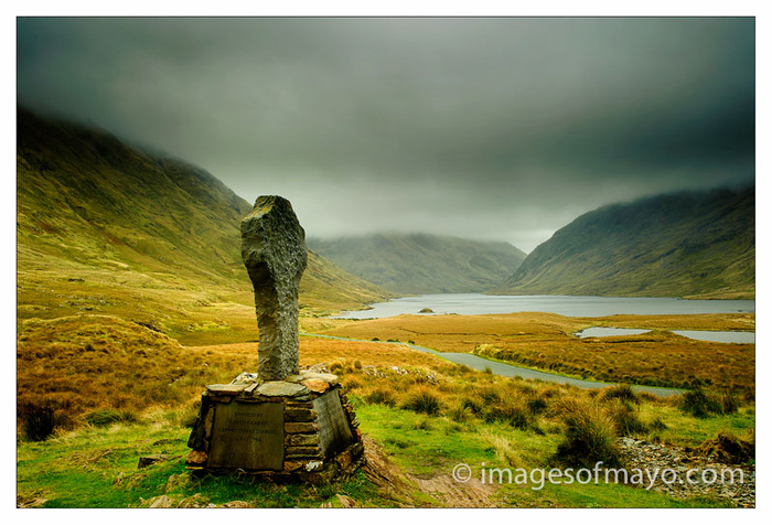 Miserable kind of day here in Kiltimagh today, there was not even a sign of the sun at sunrise today! It did attempt to make an appearance around sunset so I headed out for a few minutes with the camera to try and find a suitable vantage point, but it came to nothing. So here is a picture taken some time ago, there is no sun in this one either. This is a famine memorial in the Doo Lough Valley.