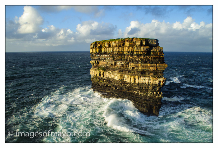This picture of Dun Briste was taken on Sunday. It was so windy it was almost impossible to hold the camera steady , even on a very low tripod. I lay on the ground to take this picture. It was taken about 50 minutes before sunset and the sun is lighting Dunbriste beautifully. I think it looks like a big slice of cake made up of lots of different layers.