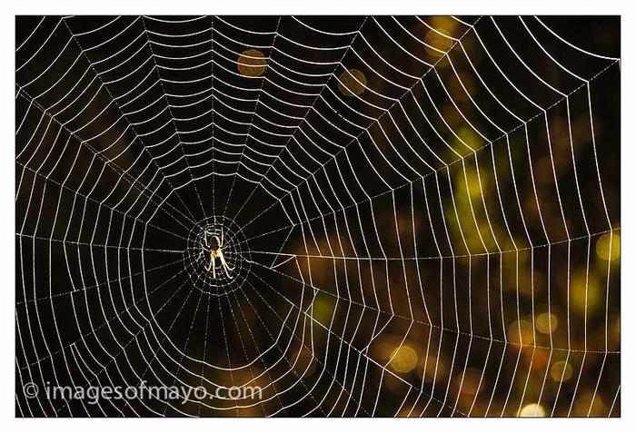 One of the signs of autumn is the colder mornings. Its about this time every year when we can suddenly see the cobwebs in the ditches. Its only for an hour or two when the sun is low in the sky and the temperature is cold enough to keep the dampness on the webs. I was out this morning and they were all over the place! The remarkable thing is of course that they were all over the place yesterday also but I could not see them, so if I walked through the same area I would be wrecking all these amazing constructions and not even know it! The trck to photographing them is to get the sun behind the cobweb but keep a dark background. Even the spider has been lit up in this picture.