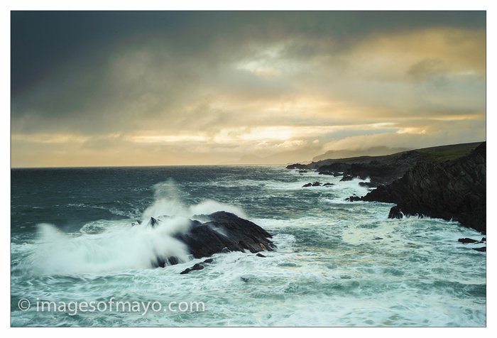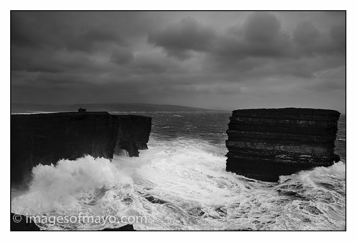Our prevailing winds in Mayo are from the West, but yesterday evening a gale blew in from the North. So I thought Downpatrick Head and Dunbriste would be worth a visit. My neighbour Tony came with me and while it was windy in Kiltimagh it was a whole lot wilder at Downpatrick Head. We hesitated to walk out to the head, and when we did it was like walking with somebody pulling you back on a rope! When we got out to the head we crawled to a point maybe 30 feet from the edge to take out pictures. Normally I would go to the edge but even thirty feet away I felt really vulnerable. As you can see from the picture it was very dark , we did not bring tripods because of the wind. I don't have VR on my lens so I had to put the iso up to 800 to get a shutter speed of 1/100 at f3.5, not my usual landscape settings! The walk back to the car was much quicker as we had the wind at our backs.!