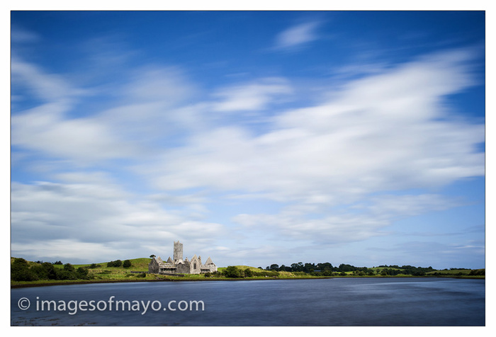 I was driving home from Kilalla a couple of mornings ago when the sun suddenly appeared and there was a clearing, so I decided to make a quick detour to Rosserk Abbey . When I got there I discovered the abbey was undergoing some repairs and had scaffolding erected along its Eastern wall. This meant I had to make the abbey very small in the photo so as not to highlight the scaffolding.. It was very windy and a slow shutter speed has resulted in movement in the cloud and the water .