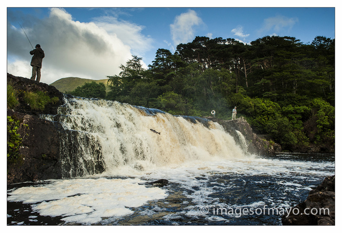 This evening I met up with Steve for what has become our annual one to one session. We did a tour of some of the photographic locations of South West Mayo. We had a little trouble with the light, the good light seemed to be always behind us or in front of us, but we did catch up with it occasionally. We visited Aasleagh Falls, there was a run of Salmon on and they were regularly seen jumping the falls. there were also a couple of fishermen trying to catch them . It looks as if this Salmon chose his moment to make a run for it just when the fisherman had turned his back to fix his rod!