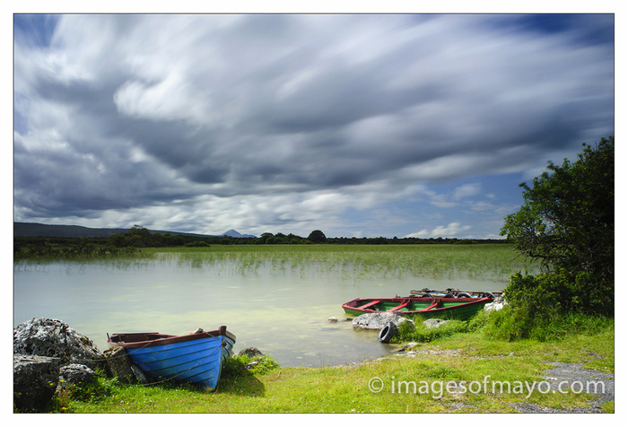 I was in Castlebar around lunchtime today to return the bike I had borrowed for yesterdays race. The weather was lovely, bright but cloudy, so I took a quick trip out to Castlbourke where I took todays picture. While there Mayo were playing Sligo in the Connaught Final and I was listening on the radio, that prompted me to take this particular picture because one of the boats was sporting the red and green of Mayo! I was about 20 minutes waiting for the sun to come out for the picture.