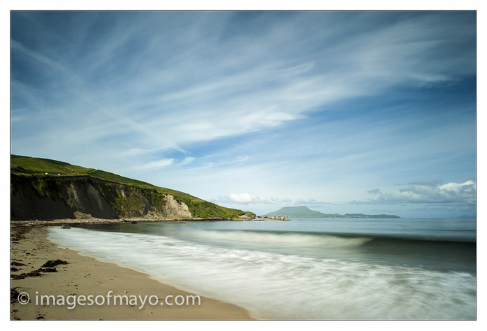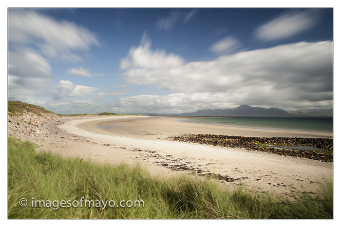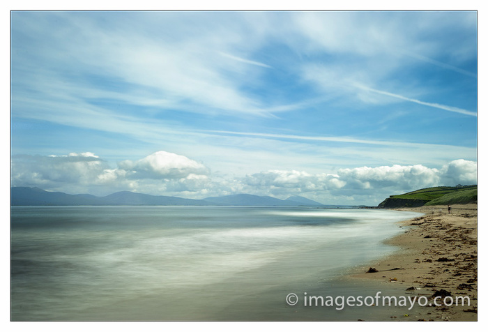 Apologies for being so late posting today. Had a great day in Mulranny. After such a long period of dull and wet weather it was great to spend the day in Mulranny where the sun shone for most of the day. This picture was taken at about 6pm this evening and is a slow shutter speed { about 1 1/2 minutes which is why the clouds are "moving" . Its hard to believe that such a magnificent beach could be empty on such a lovely day.