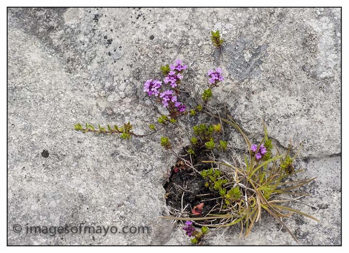 Just like last Monday I went to Westport today and just like last Monday it was pouring rain, this must be the wettins Summer we have had in years. Unlike last week I decided it was just too wet to take the camera out and so anm posting another picture from the Burren in Co clare. The Burren is famous for its limestone and its wild flowers. I am always amazed by how all kinds of flowers and even small trees grow in every crack of rock. I thought this little Thyme flower was almost a garden in itself.
