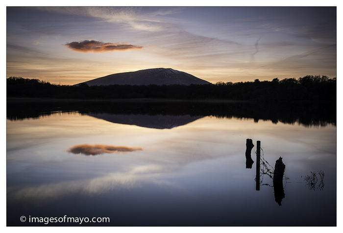 Just in from a lovely evenings photography on the shores of Lough Conn. I had resisted going out all afternoon, instead getting more work done in the garden,( for which I am chalking up the Brownie points!) but at 7pm with sunset at 8.35 it was definitely time to head out. I decided to head to Lough Conn and a spot where I knew the sun would set behind Nephin. Of course I got distracted along the way and took a couple of detours, I suddenly realised that while sunset was due at 8.35 given that from my location it was going down behind Nephin mountain it would obviously happen earlier so had to abandon my distractions and get to my location in a hurry. I was glad I did because it was quite spectacular. Once I got there finding the right spot to get my picture was not easy, there was no foreground interest , but I spotted the old fence posts but had to wade through a foot of water for about 100 yds to reach this spot, fortunately although the depth of water varied a lot it never actually came over my wellington boots, I was delighted though that I made the effort when I got there as the fence posts were perfect. The only thing was that in my haste to check out the location, I left my camera bag with the filters I would need back in the car, so I left the camera on the tripod and retraced my steps,twice, still managing to avoid wet feet!