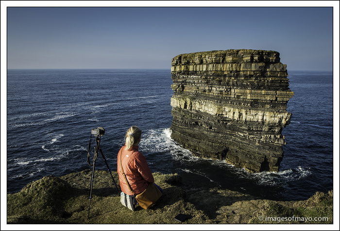 Another lovely day in Co Mayo. Today we were visited by Caroline from Limerick who recently bought a Fuji XE1 camera and came for a one to one class in how to use it. After we had covered all the basics and buttons etc on the camera we decided to take a trip out to Dunbriste for Caroline to try out some of her new skills. Dunbriste looked lovely today although the sea was calmer then I would usually like, but Caroline tried all kinds of different ways of photographing it, and was I think a little surprised in how much thought had to go into an apparently simple photograph. For example today Caroline was taking slow shutter speed pictures to blur the water, but had to wait several minutes between shots as she waited for a wave big enough to create the effect she was after,and then had to hit the shutter button at just the right moment, I think she got some good pictures though.
